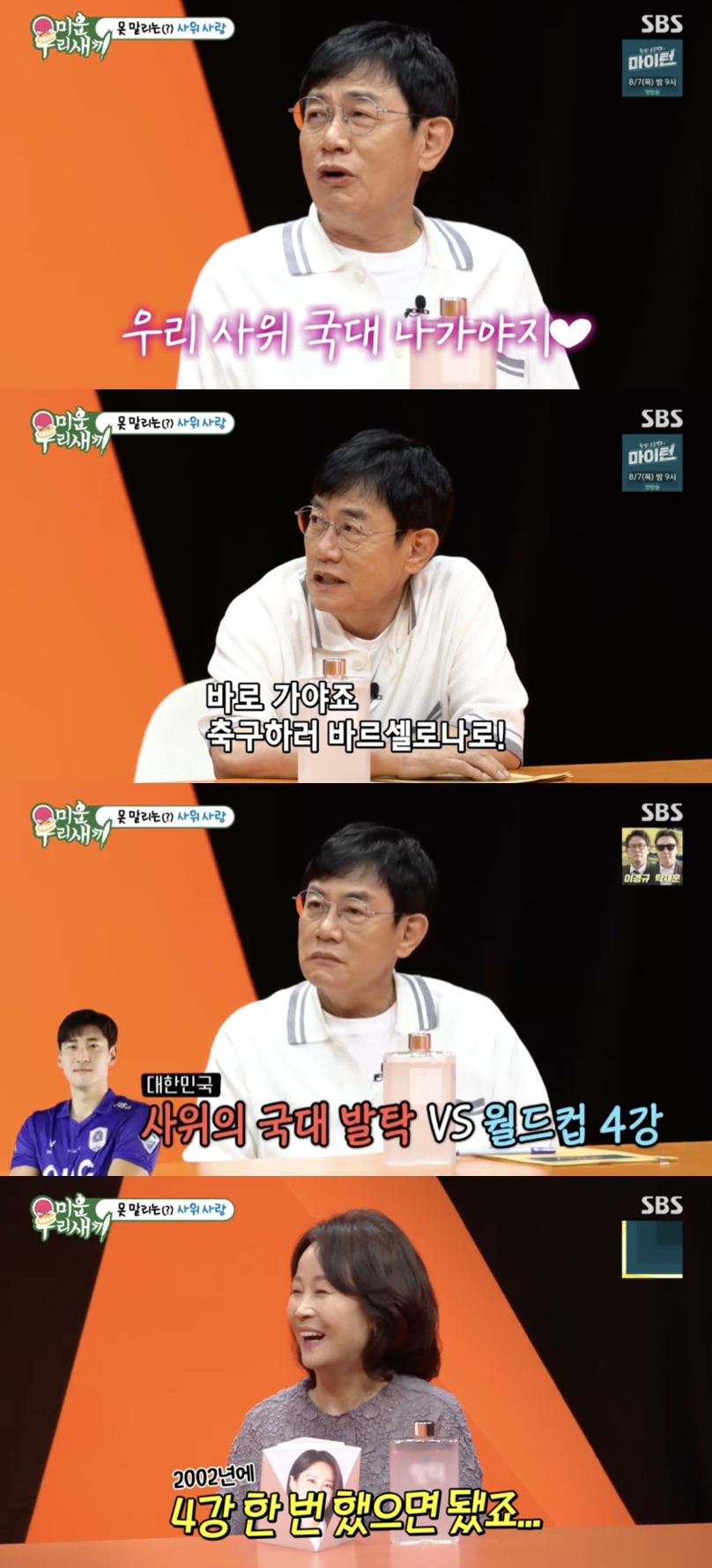 이어 서장훈이 "사위가 대한민국 국가대표로 발탁되는 게 더 좋냐, 아니면 2026년 월드컵에서 대한민국이 4강에 오르는 게 더 좋냐"고 묻자, 이경규는 버럭하며 "2002년에 4강 한 번 했으면 됐죠, 우리 사위가 국가대표 나가야지. 그걸 질문이라고 하냐"라고 답해 웃음을 자아냈다.