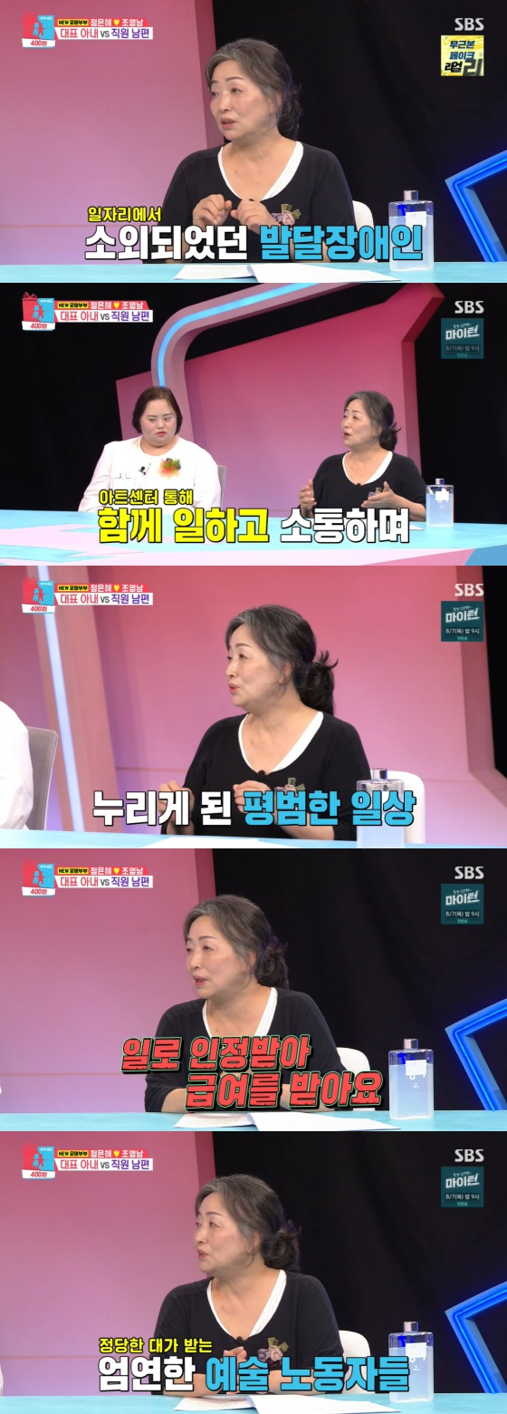 정은혜는 현재 자신과 조영남을 비롯, 발달 장애를 가진 14명의 작가들이 소속된 아트센트를 이끄는 수장이다. 이에 대해 정은혜 어머니는 "사실 발달 장애인들의 일자리가 굉장히 배제된 상황"이라며 "서로 소통하는 일상을 누리는 게 얼마나 힘든 일이었는지 모른다. 지금은 (아트센터 소속) 14명의 작가가 그림을 그리고 그것을 일로 인정받아 급여도 받는다. 4대 보험도 해준다"고 털어놨다.