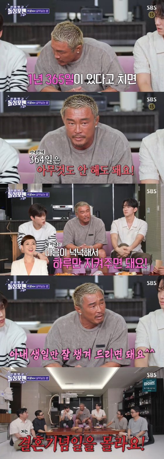 추성훈은 "1년 365일 중 364일은 잘 안 챙겨도 된다. 아내는 마음이 넉넉해서 1년 중 하루만 잘 챙기면 된다. 그 하루는 아내의 생일이다. 그 하루만 잘 지켜서 아내를 챙겨주면 된다"고 주장했다.