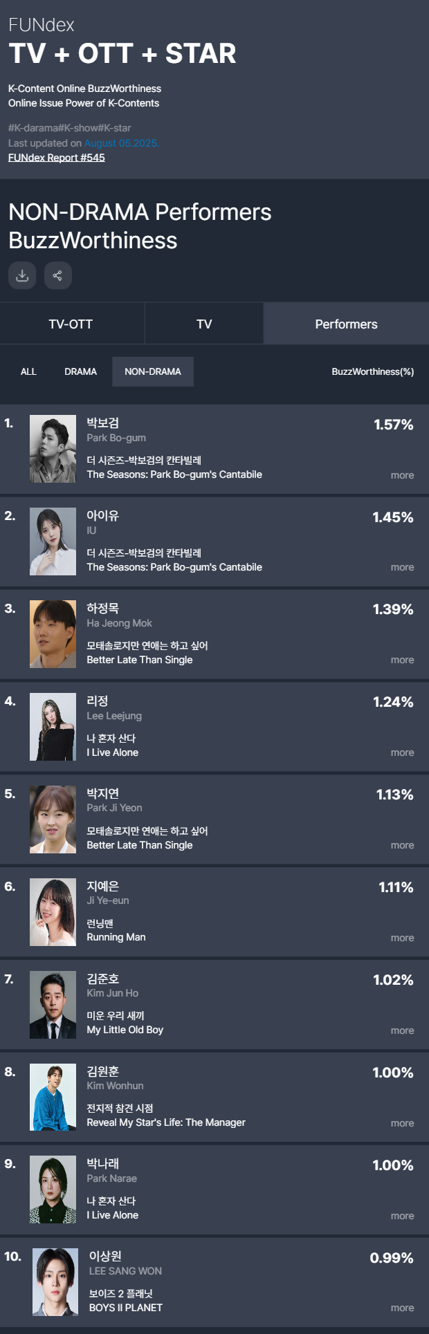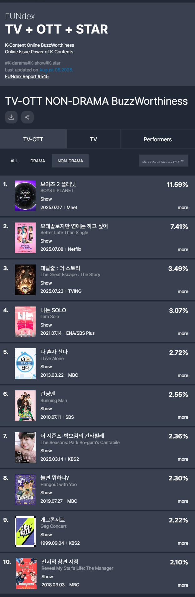 굿데이터코퍼레이션이 발표한 7월 5주차 순위는 2025년 7월 28일부터 2025년 8월 3일까지 방송 또는 공개 중이거나 예정인 TV 비드라마와 OTT 오리지널 비드라마 그리고 각 프로그램에 출연한 출연자와 게스트를 조사 대상에 포함하였다.