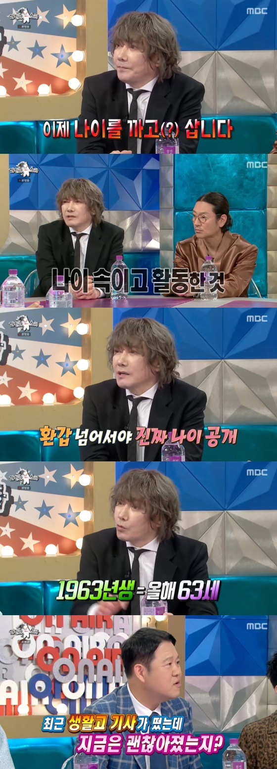이날 김장훈은 "요즘 나이를 까고 산다"며 "내가 가장 후회하는 일이 나이를 속인 거다. 소속사 옮길 때 나이 속였다"고 말문을 열었다.