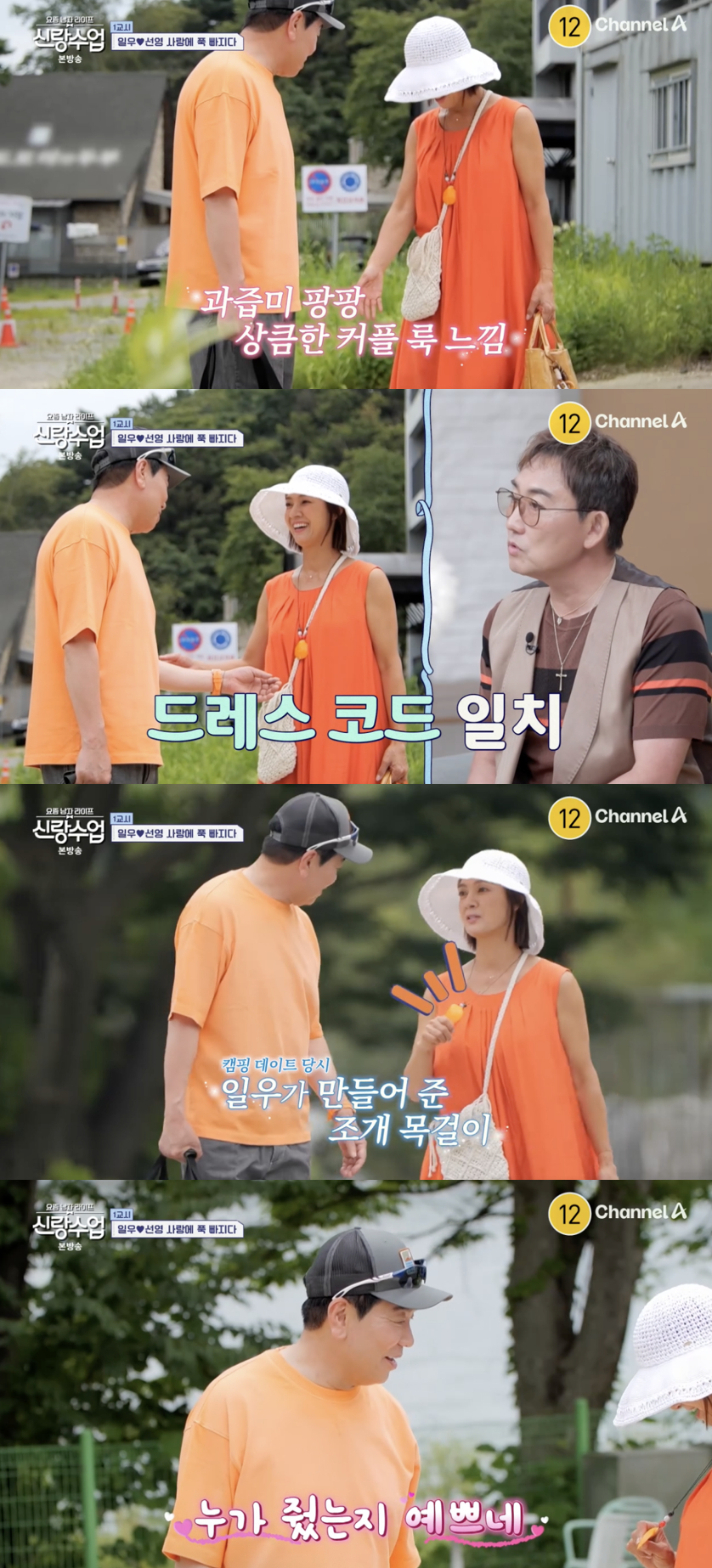 이날 박선영은 주황색 원피스에 김일우가 직접 만들어준 조개 목걸이를 착용하며 화사한 분위기를 자아냈다. 김일우 역시 주황색 반팔 티셔츠로 과즙미 가득한 패션을 선보이며 '커플룩'을 완성했다.