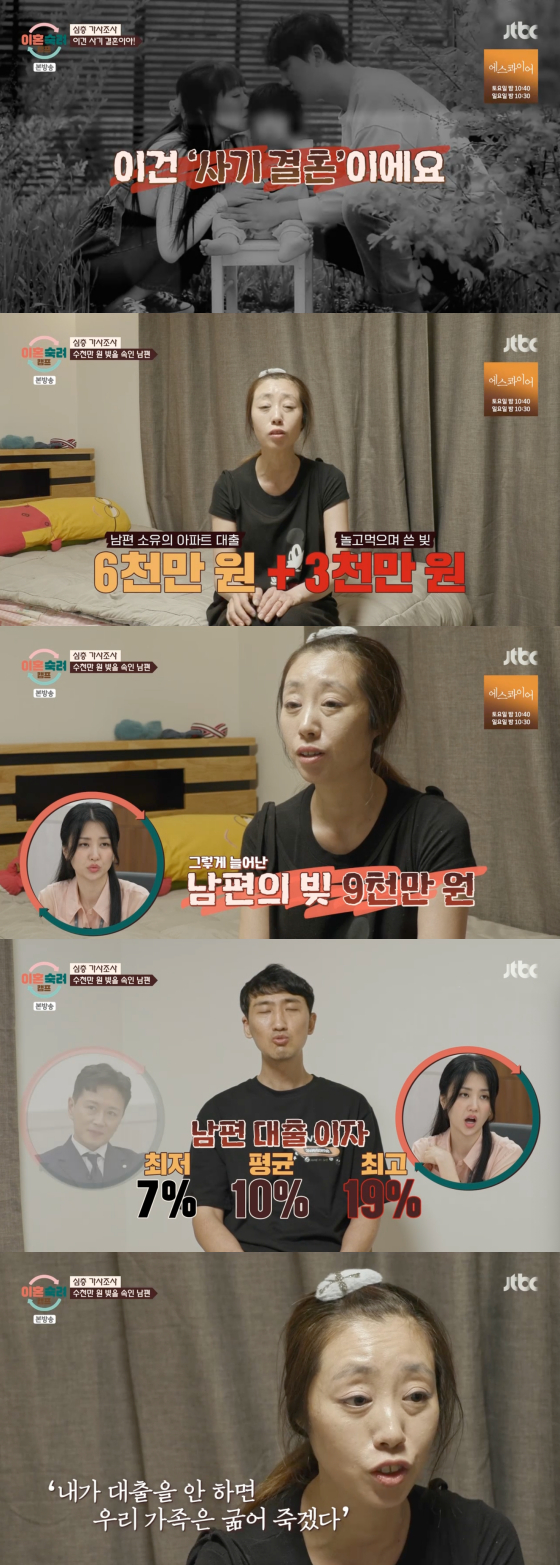 아내는 "나는 39년 살면서 대출 한 번 받은 적이 없는데 남편이 제 앞으로 대출을 받으라고 시켰다. 대출하면 자기가 갚는다고 해놓고 막상 대출 받으니 행동이 아예 달라졌다. 그렇기 때문에 사기 결혼인 것"이라고 말했다.