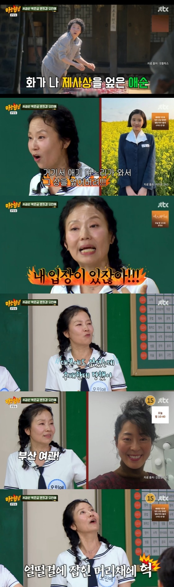 오민애는 "제사를 치르는데 집안의 가장 어른이 제사상을 치우고 있을 때 애기 며느리가 와서 그 상을 엎으면 눈이 돌아가겠나, 안 돌아가겠나"라고 토로했다. 이에 서장훈이 "살짝 엎을 만 하던데"라고 반박하자 오민애는 "그건 애순이 입장이지만 내 입장이 있다. 거기다가 나보고 아가씨 잠녀 시키라고 하지 않았냐. 따귀를 때릴 수밖에 없었다. 애순이가 뺨을 제대로 때려달라고 부탁했다"라고 항변해 웃음을 자아냈다.