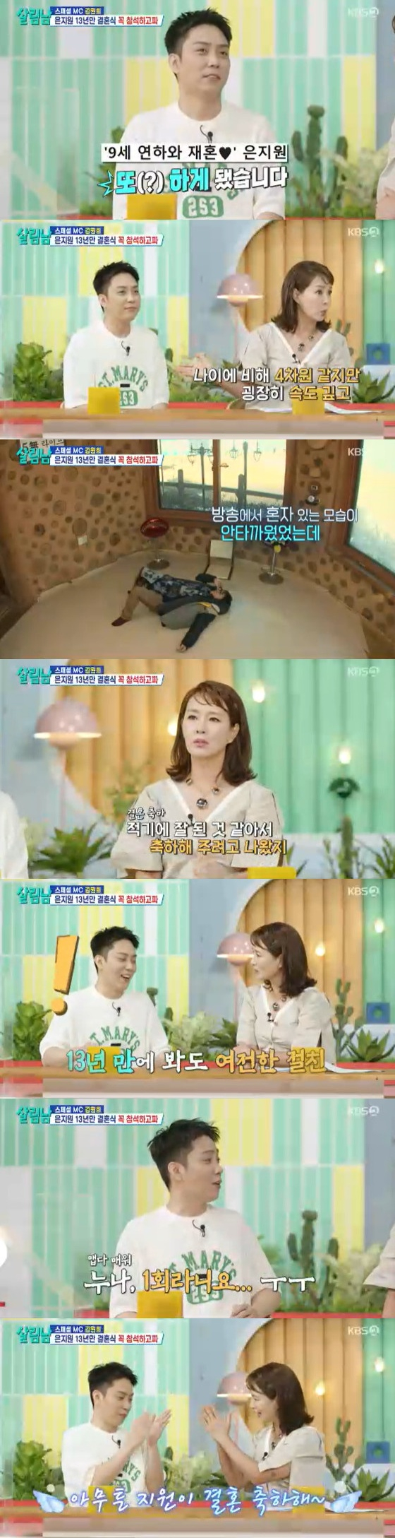 이날 오프닝에서 은지원은 김원희가 "좋은 소식 있지 않냐"라는 언급에 "(결혼을) 또 하게 됐다"라고 수줍게 얘기했다.