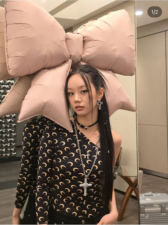 공개된 사진 속 혜리는 프랑스 디자이너 브랜드 '마린세르'의 원 숄더 탑을 입은 채 핑크색 리본 풍선 아래서 카메라를 응시하고 있다. 초승달 문양이 특징인 '마린세르'의 의상은 걸그룹 '블랙핑크', 'ITZY', '레드벨벳' 등 아이돌이 즐겨 입으며 한때 인기를 모은 바 있다.