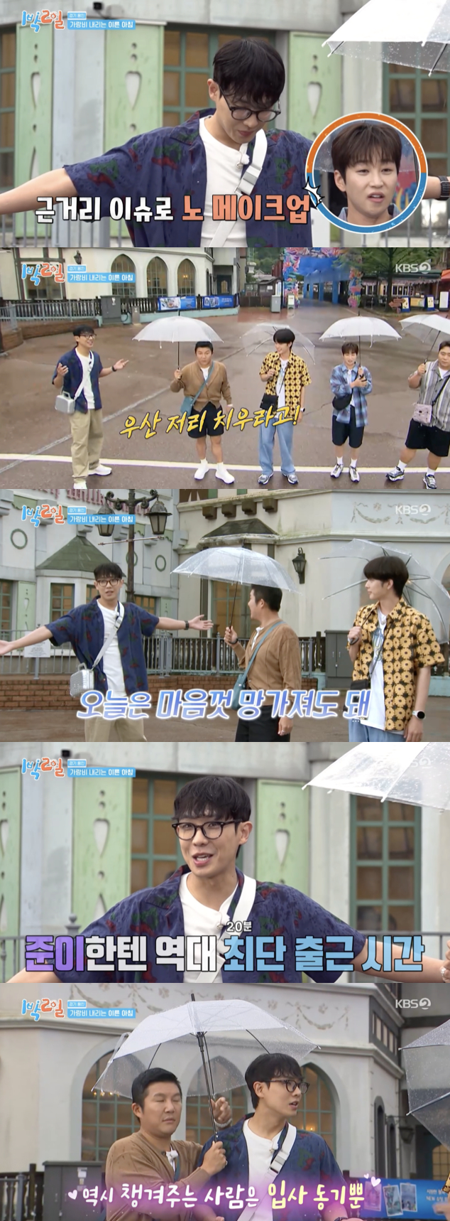 이날 오프닝 무대는 비 내리는 한 놀이공원. 멤버들이 우산을 쓰고 등장하는 가운데, 이준만은 맨몸으로 비를 맞으며 등장했다. 조세호는 "준이는 우산을 안 쓴다고 하더라. 내가 같이 쓰자고 했더니 단호하게 '저리 치워요'라고 하더라"라며 웃음을 터뜨렸다.