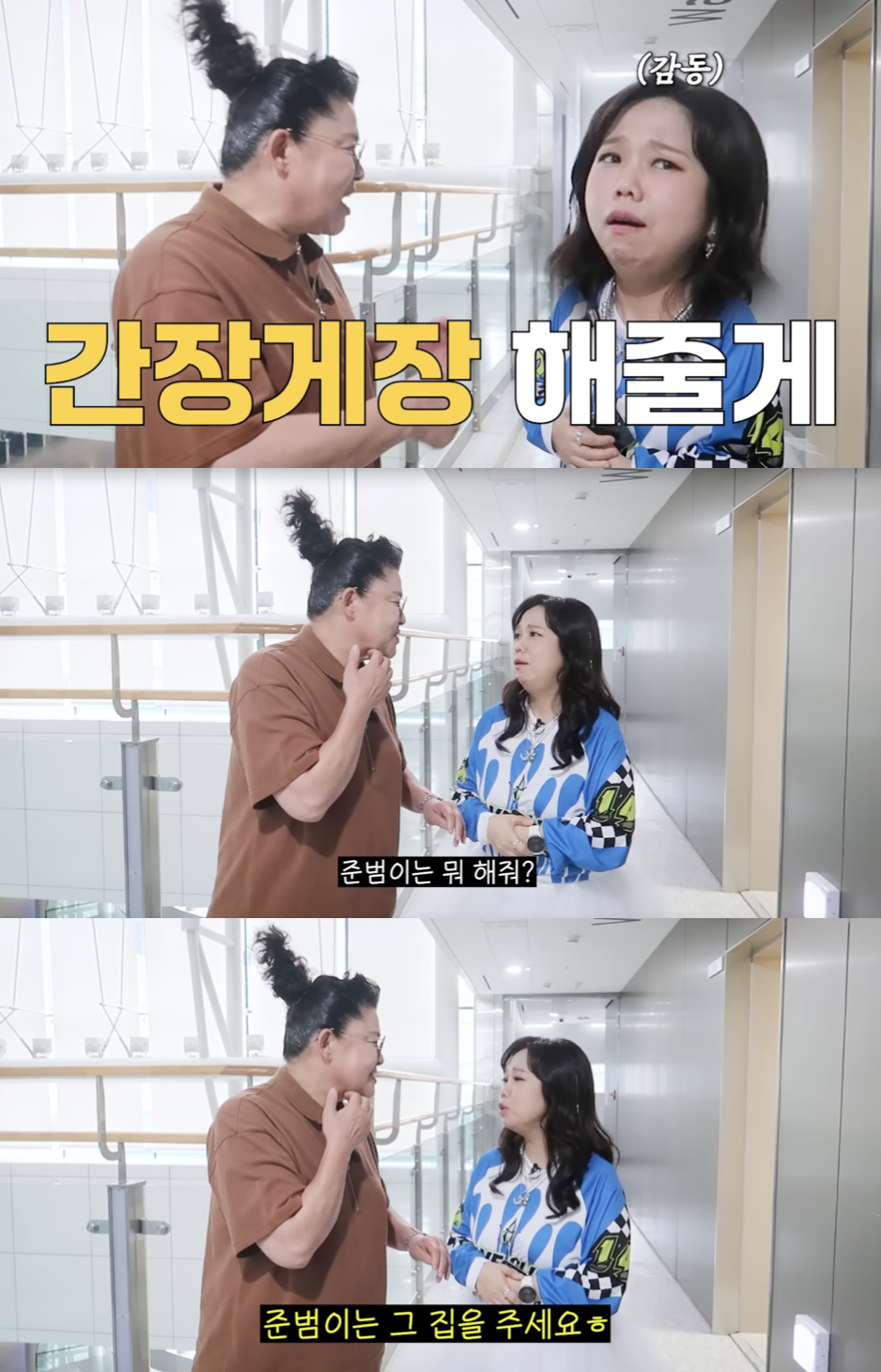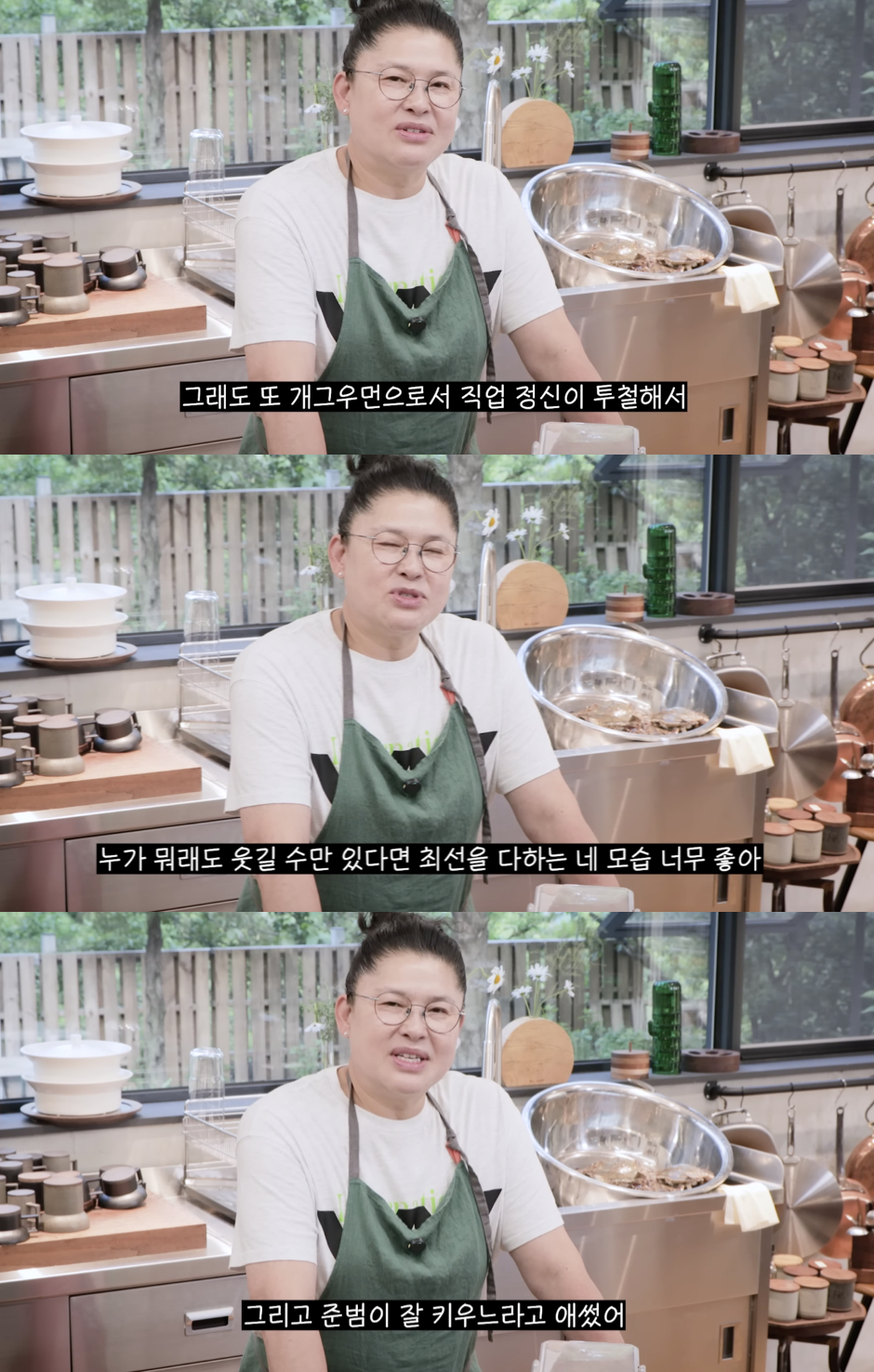 싱싱한 꽃게를 손질해 순식간에 완성한 뒤, LA갈비와 파김치까지 넉넉하게 포장했다. 그러면서 "애들 키우랴 방송하랴 며느리 하랴 와이프 하랴 힘들지?"라며 후배의 고생을 먼저 헤아렸다. 이어 "그래도 개그우먼으로 직업 정신이 투철해서 웃길 수만 있다면 최선을 다하는 네 모습이 너무 좋아"라고 칭찬했다.