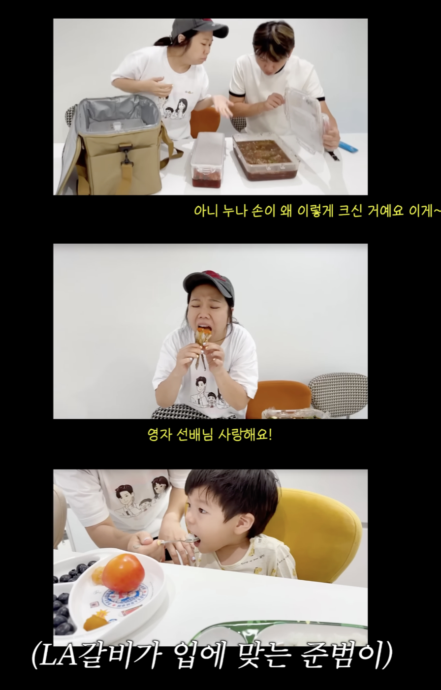 선물을 받은 홍현희는 남편 제이쓴, 아들 준범이와 함께 음식을 맛봤다. 홍현희는 "너무 맛있다"는 듯 미간을 찌푸리며 감탄하며 "제가 임신 때 게장 못 먹었다고 농담으로 했는데… 선배님 미쳤어요, 이거. 영자 선배님 사랑해요!"라고 진심 어린 고마움을 전했다.