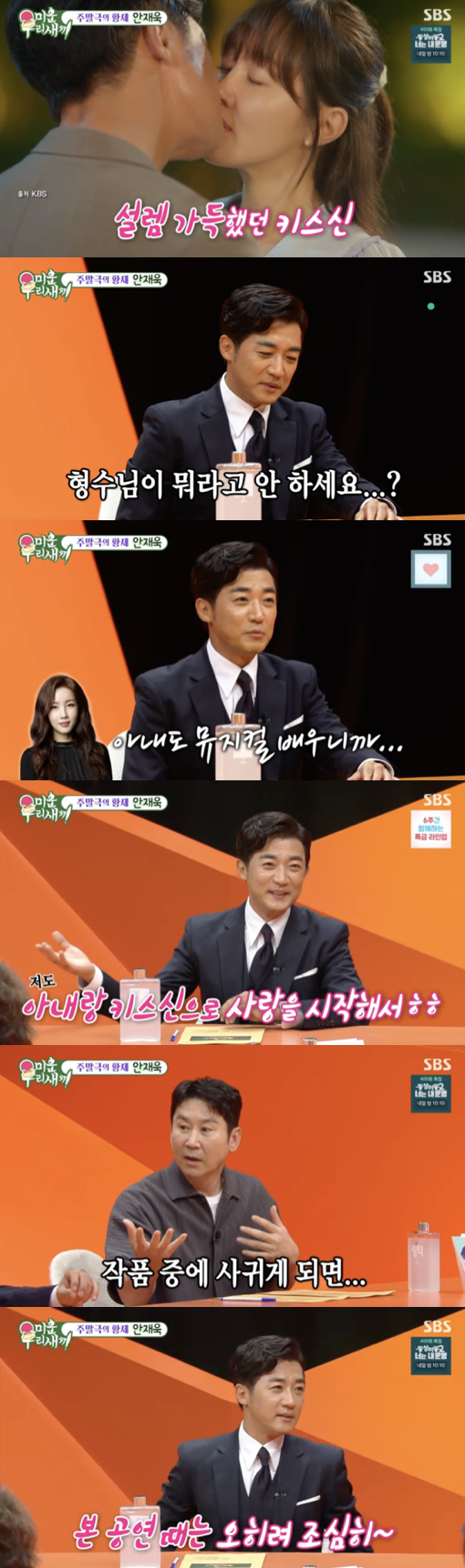 안재욱은 웃으며 "아내도 배우다. 저도 아내랑 키스신으로 사랑하면서 시작했다"고 답했다. 이어 "그래서 같이 보고 그러면 씩 웃고…"라며 주먹으로 옆사람을 툭 치는 시늉을 해 웃음을 자아냈다.