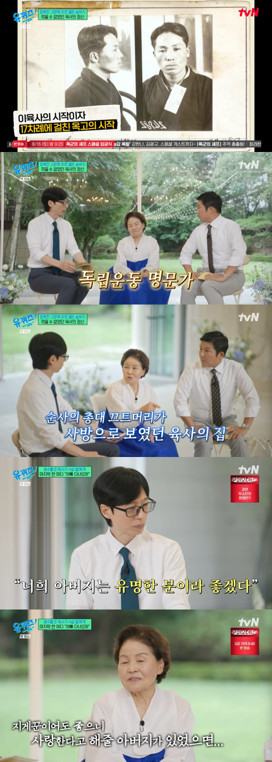 유재석이 "이육사 선생님 유해는 독립운동가 이병희 선생님이 수습하셨다"고 말하자 이 여사는 "관 뚜껑을 열어보니 우리 아버지가 온몸은 피가 낭자하고 눈도 감지 못 하고 돌아가셨다고 한다"고 전했다.
