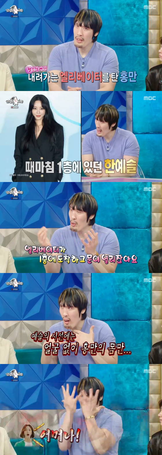 최홍만은 "한 번은 호텔 헬스장에서 운동을 하고 내려오는 길이었다. 엘리베이터에 타고 있었는데 1층에서 배우 한예슬이 기다리고 있었던 거다"고 말했다.