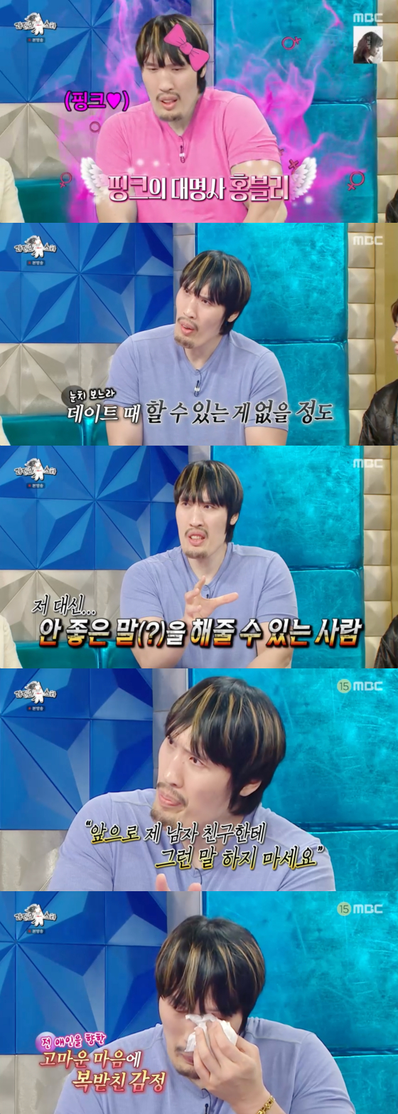 최홍만은 "자꾸 시비 거는 사람들이 있다. 눈치 보느라 데이트 때 할 수 있는 게 없을 정도다. 제 성격이 여성스러워서 남자 같은 여자를 만난다. 저 대신 (시비 거는 사람한테) 안 좋은 말을 해줄 수 있는 사람을 만난다. 대신 연하가 좋다"고 털어놨다.
