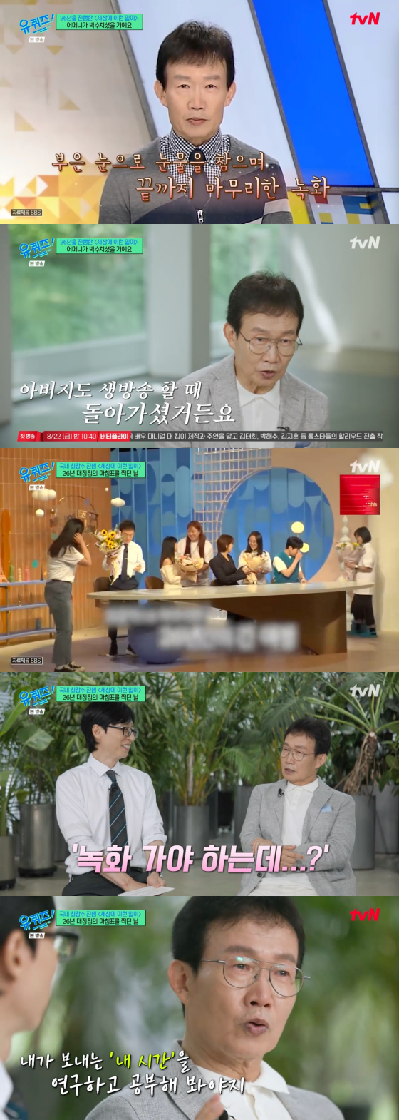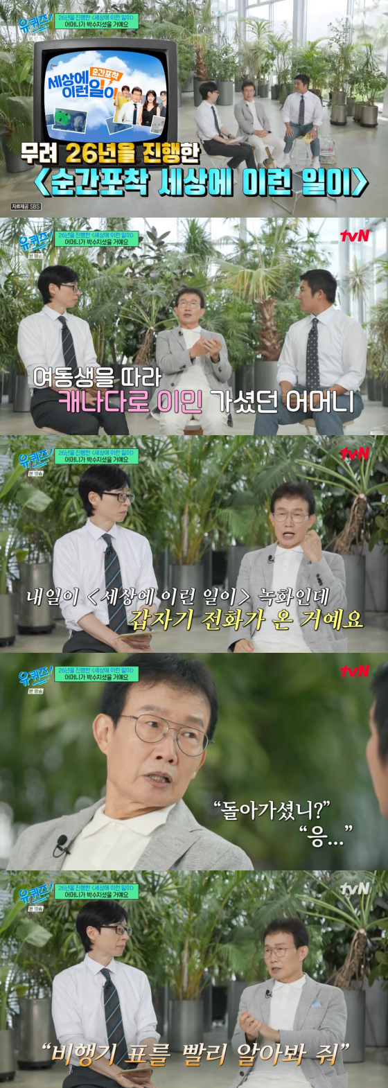 무려 26년을 진행한 SBS '순간포착 세상에 이런 일이'에 얽힌 비화도 공개했다. 그는 "어머니가 캐나다에 살던 여동생 부부와 함께 살고 있었다. 그런데 '세상에 이런 일이' 방송 하루 앞두고 어머니 부고 전화를 받았다"고 떠올렸다.