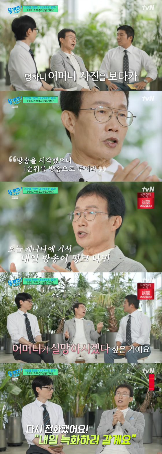 그는 "아버지도 내가 생방송 할 때 돌아가셨다. 방송 끝나고 나왔더니 사람들이 '응급실로 가라'고 하더라. 응급실에 갔더니 이미 돌아가신 상태였다. 아들로서는 영 잘못된 거다. 그런데도 우리 어머니는 늘 방송을 최우선으로 두라고 하셨다"고 전했다.