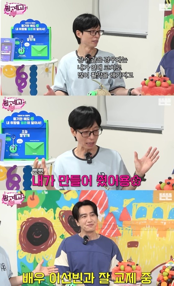 유재석은 이에 굴하지 않고 "광수의 연애. 지금 선빈이 잘 만나고 있지만 내가 만들어줬다고 해도 과언이 아니다. 내가 거기까지 다 해준 거다. 어쨌든 좋은 인연을 만났다"고 했다. 그러자 이광수는 "그렇다"며 수줍게 끄덕였다.