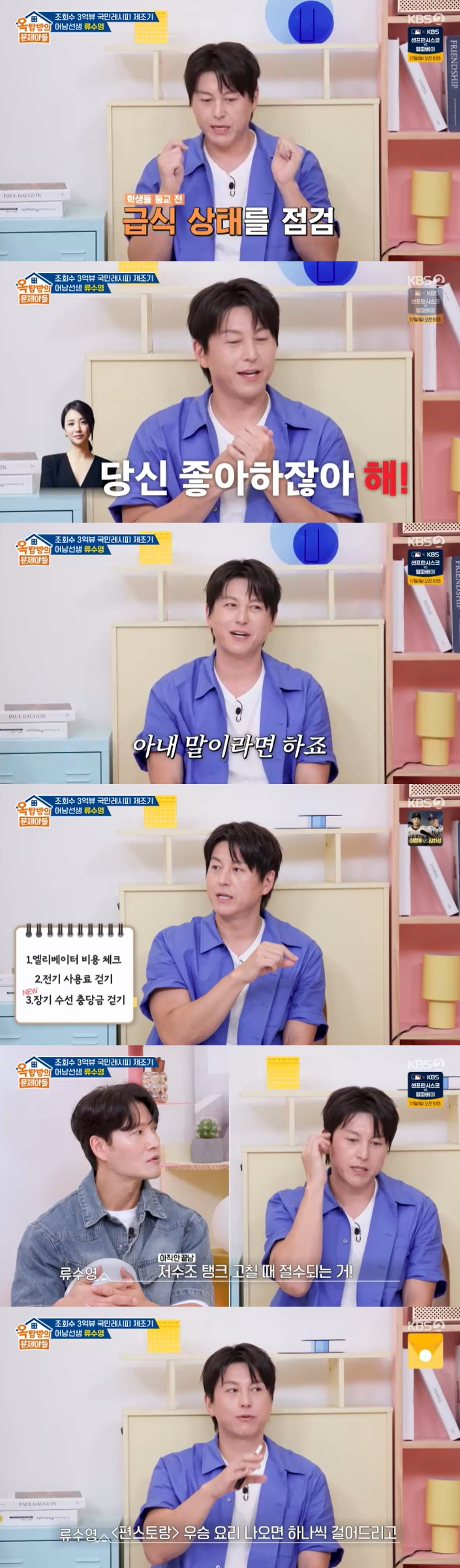김숙이 "요리는 누가 더 잘하냐"라고 박하선과 비교하는 질문을 하자 류수영은 순간 더듬으며 "박하선 씨가 훨씬 잘한다"라고 말해 의혹을 샀다. 이에 류수영은 "사람이 가정이란 곳에 갇혀 살아야 하지 열려 살면 안 된다"라고 너스레를 떨었다.