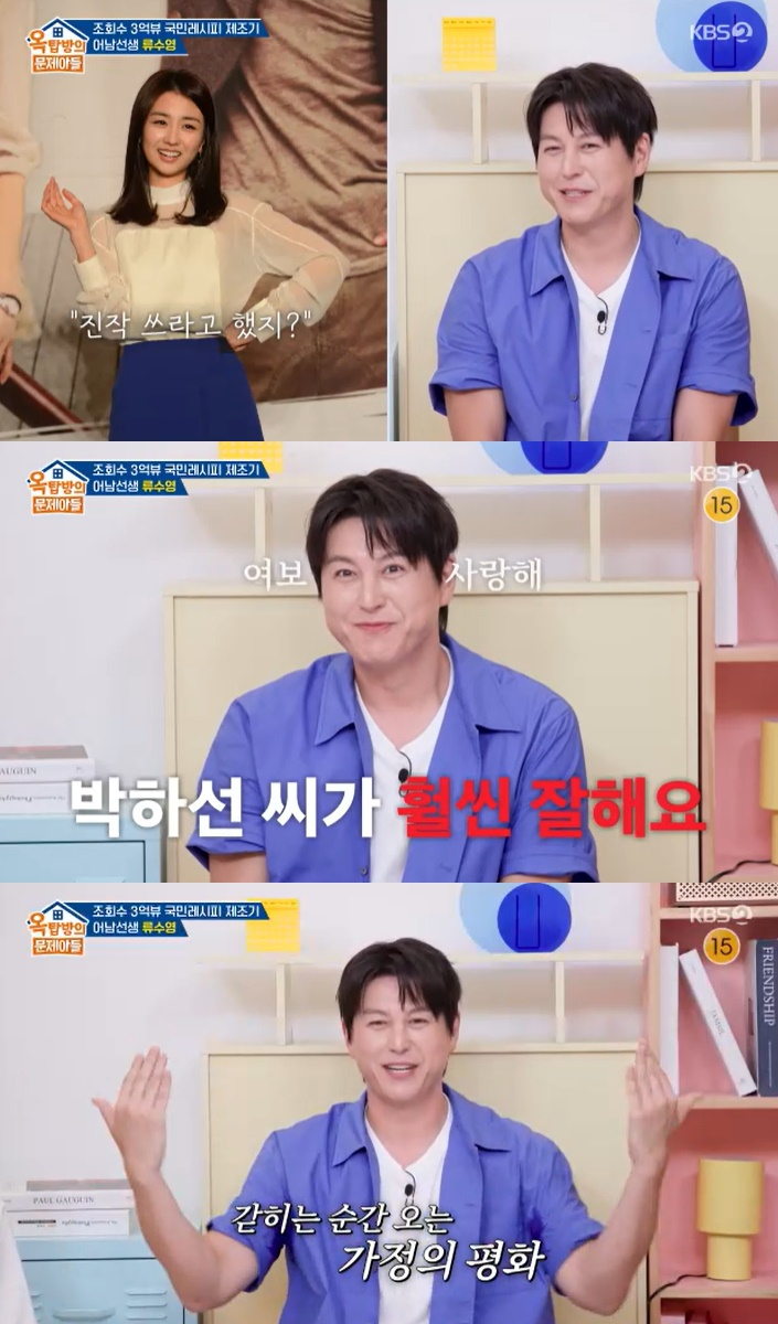 김숙이 "요리는 누가 더 잘하냐"라고 박하선과 비교하는 질문을 하자 류수영은 순간 더듬으며 "박하선 씨가 훨씬 잘한다"라고 말해 의혹을 샀다. 이에 류수영은 "사람이 가정이란 곳에 갇혀 살아야 하지 열려 살면 안 된다"라고 너스레를 떨었다.