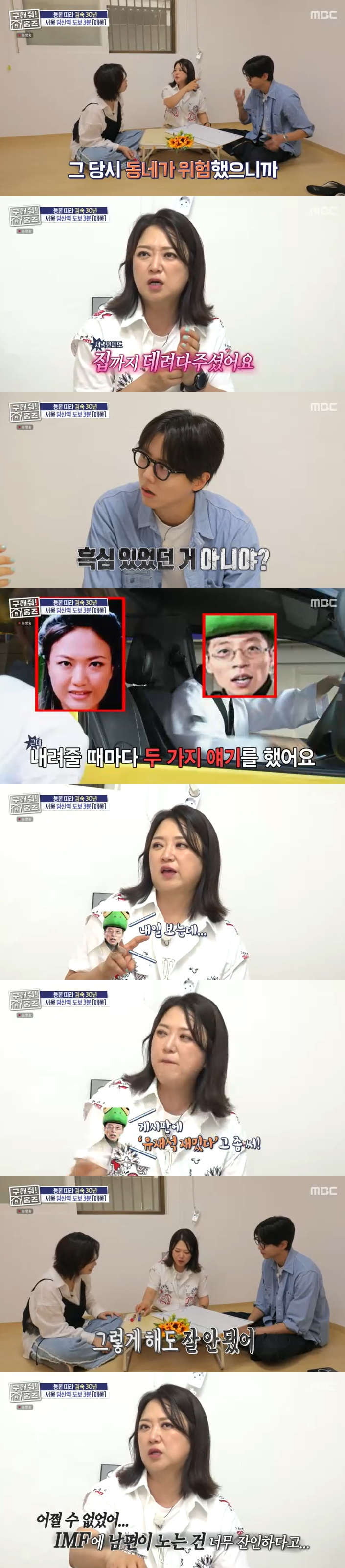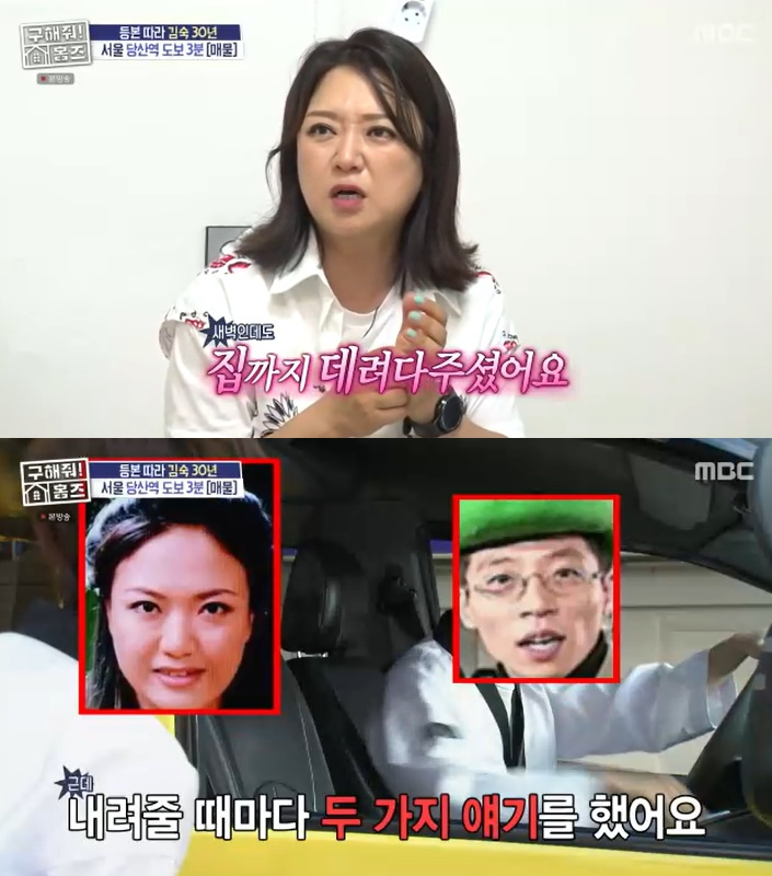 김숙은 "(유재석이) 그때 같이 코너를 하면서 당산동이 밤에 위험하니 새벽 2~3시에 끝나면 집까지 데려다 줬다"라고 말했다. 이에 주우재는 "재석이 형이 흑심 있었던 거 아니냐"라고 물었고 김숙은 "나뿐만 아니라 여자 멤버들 다 데려다줬다. 태권도 봉고차처럼 다 내려줬다"라고 말했다.