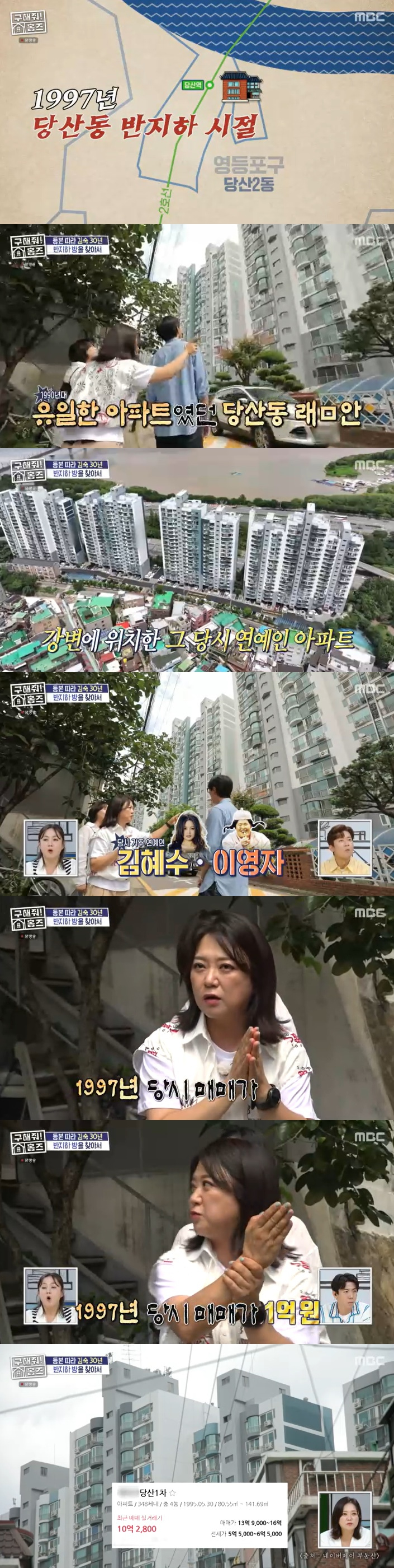 김숙이 살던 집 근처에 있던 유일한 아파트는 4개의 동으로 구성돼 있었다. 김숙은 "그때 최고의 아파트였다. 당시 김혜수, 이영자가 살았다"라며 "당시 매매가가 1억 초반이었다"라고 밝혔다.