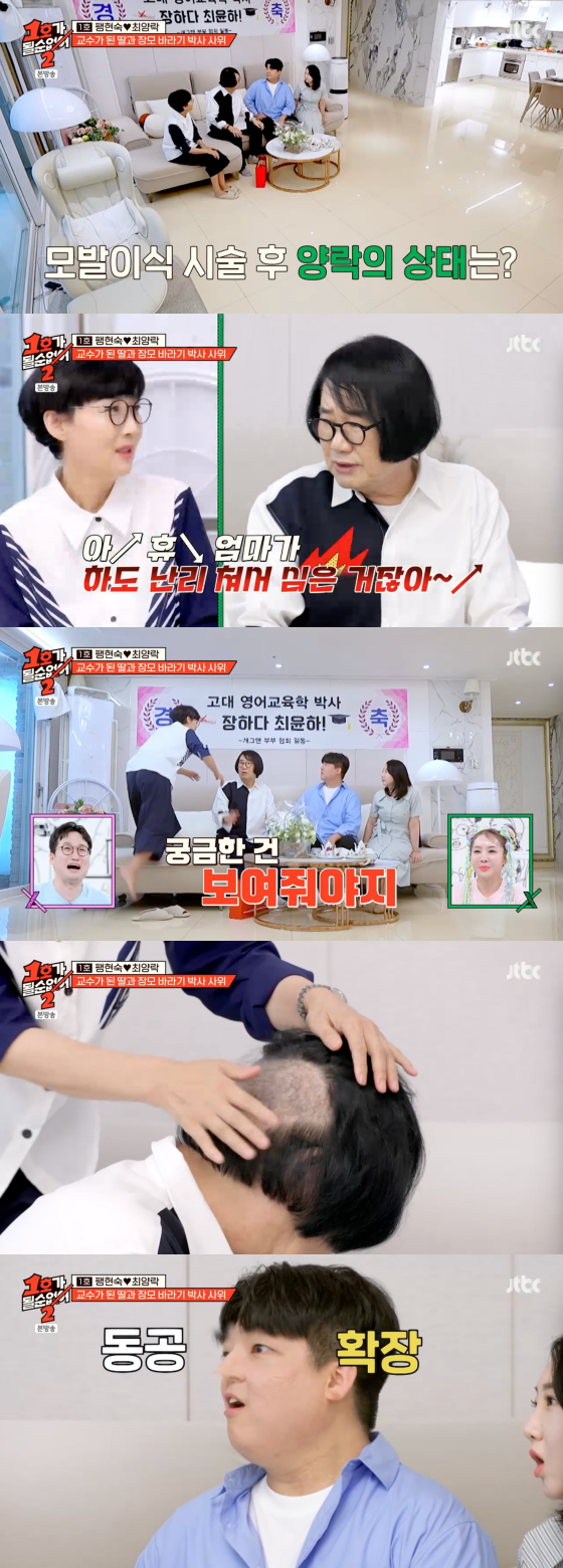 옆에 있던 팽현숙은 "궁금한 건 보여줘야 한다"고 사위 앞에서 최양락의 뒤통수 머리를 냅다 까서 보여줘 충격을 안겼다.