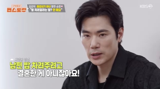 이날 김강우는 "저는 밥 차려달라는 말을 안 한다. 밥 차려주려고 결혼한 게 아니다"라고 말해 스튜디오를 술렁이게 했다.