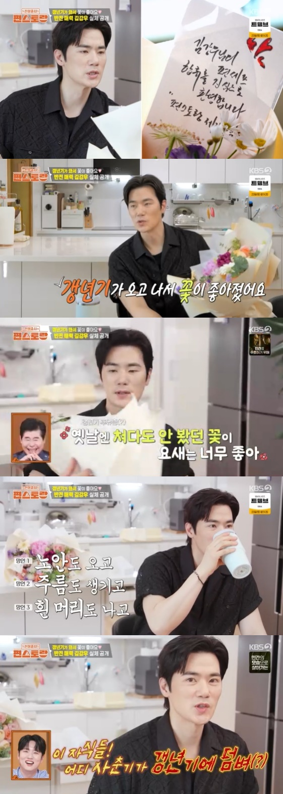 초조한 듯 손가락을 움직이던 그는 제작진이 내민 꽃다발 선물에 활짝 웃으며 "제가 요즘 꽃에 관심이 많아졌다. 갱년기가 오고 나서 좋아졌다. 옛날에는 꽃을 쳐다도 안 봤는데 요즘엔 꽃이 좋더라"라고 말해 웃음을 자아냈다.