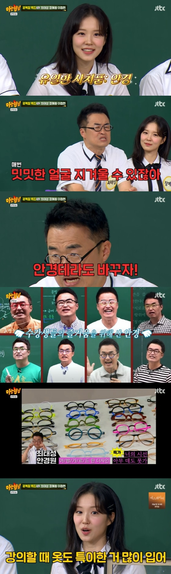이에 최태성은 "난 강의하는 사람이다. 진도를 나가야 하는데 매번 똑같은 밋밋한 얼굴이 지겨울 수 있지 않나. 근데 난 보여줄 게 없다. 안경테라도 바꾸자 싶어 특별한 안경을 찾는다"라고 설명했다.