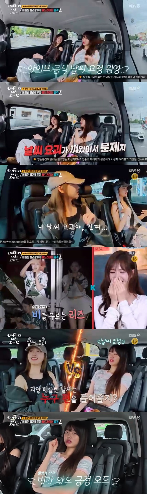 장원영이 지목한 날씨 요괴는 리즈였다. 이어진 화면에는 비를 쫄딱 맞고 공연하는 아이브의 모습이 공개돼 웃음을 자아냈다. 리즈는 "나 날씨 요괴다. 어떡하냐"라고 한숨을 쉬었다.