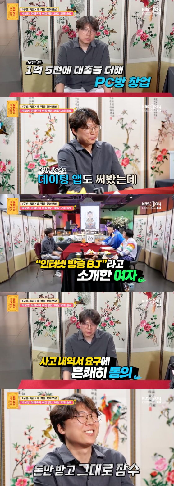 사연자는 "데이팅 앱으로 이성을 만나보려고 했는데 사기를 당했다. 상대방이 인터넷 방송 BJ라고 하더라. 부모님이 수술을 하는데 수술비가 없다면서 돈을 빌려달라더라"고 털어놔 안타까움을 자아냈다.