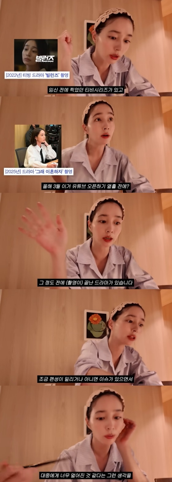 그는 "많은 분이 '왜 작품을 안 하느냐', '연기 복귀 안 하느냐'고 물어보시는데 사실 저는 임신 전 2022년에 찍었던 티비 시리즈(티빙 드라마 '빌런즈')가 있고 올해 3월 유튜브 오픈하기 열흘 전에 끝난 드라마(드라마 '그래 이혼하자')가 있다. 지금 편성을 잡고 있는데 첫 번째 드라마는 이슈가 있어서 밀렸다"고 설명했다.