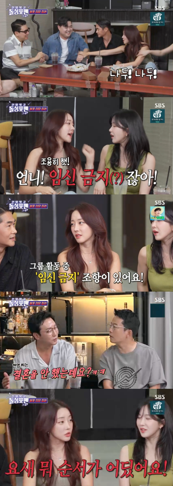 이날 조현영은 고우리를 향해 "언니 임신 금지 아니냐"고 말했고, 고우리는 "조용히 해라. 나 임신할 거다"고 자폭해 웃음을 자아냈다.