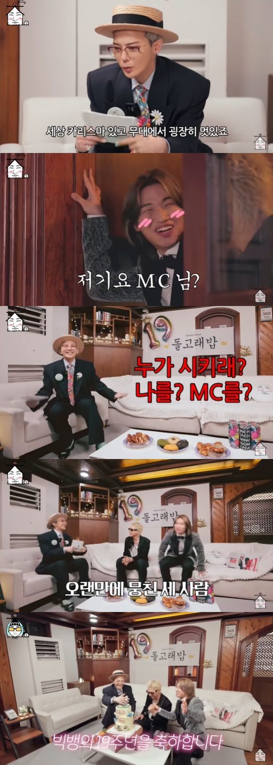 오랜만에 뭉친 세 사람은 프로그램의 이름을 '집대성'이 아닌 '쥡대썬'으로 정한 뒤 19주년 기념 상패를 나눠 가졌다. 반짝이는 상패를 본 대성이 "무드 등으로 쓸 수 있겠다"며 반색하자 지드래곤은 "어떤 무드가 필요하냐"며 깐족대 대성을 당황케 했다.