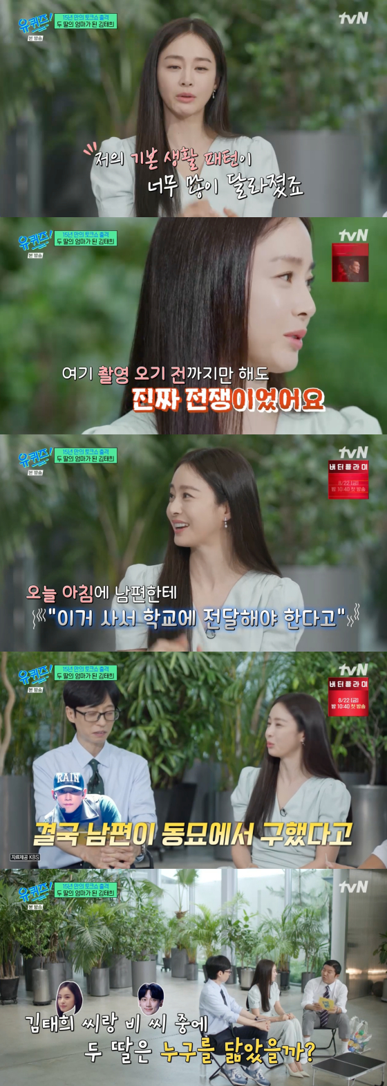 이날 김태희는 과거의 자신과 달라진 점에 대해 "기본 생활 패턴이 너무 많이 달라졌다. 제가 챙겨야 할 가족들이 있고, 할 일이 너무 많아졌다"고 밝혔다.