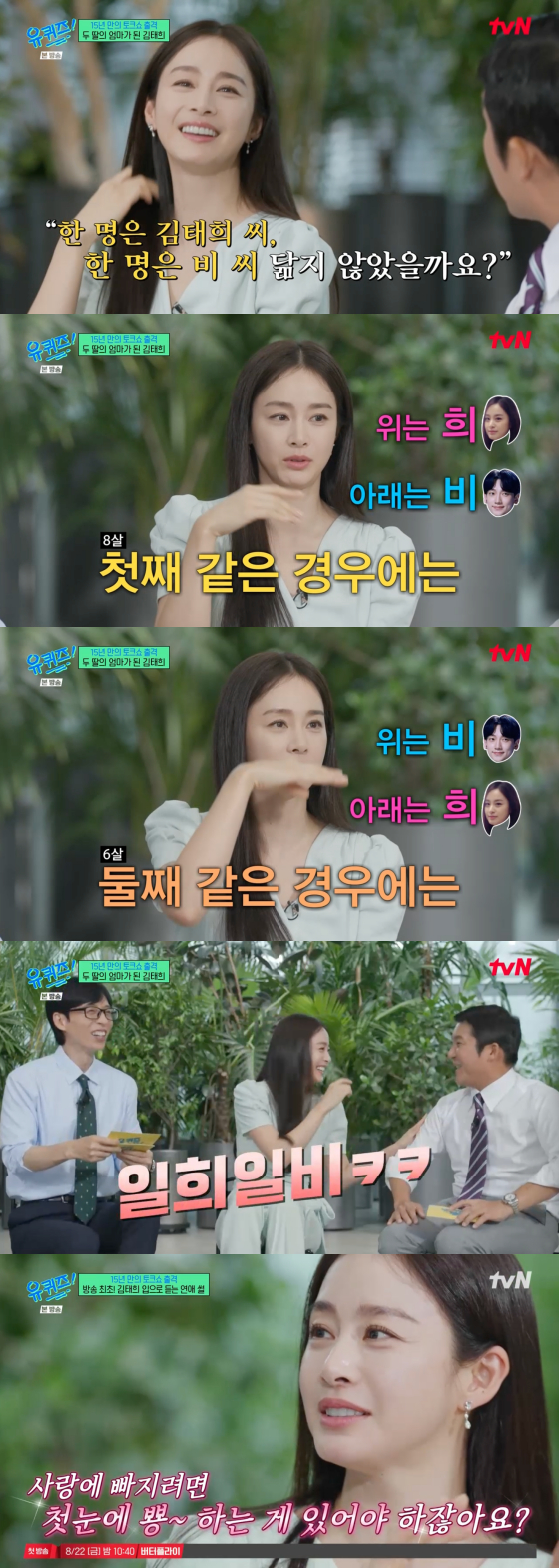 이를 듣던 조세호가 "두 딸은 누구를 닮았냐"고 묻자 김태희는 "첫째는 얼굴 위에는 저, 아래는 남편, 둘째는 얼굴 위에는 남편, 아래는 저다. 희비교차 아니, 일희일비"라고 말해 웃음을 자아냈다.