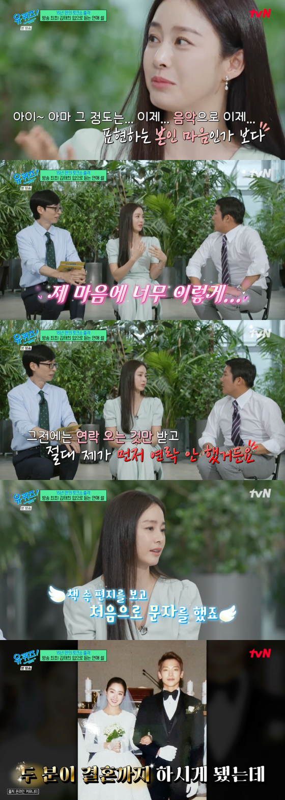 유재석이 "비와 결혼해야겠다는 생각이 언제 들었냐"고 질문하자 김태희는 "둘 다 첫눈에 반한 건 아니었던 것 같다. (비에 대해) 인기 많고 열심히 하는 가수라고 인정은 하지만 사랑에 빠지려면 첫눈에 뿅 해야 하는데 그건 아니었다"고 고백했다.