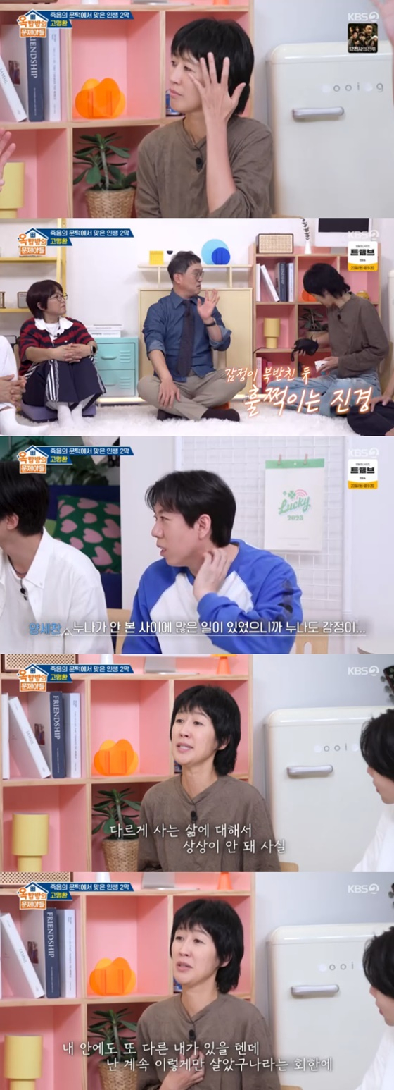 이에 홍진경은 "나도 일생을 연예인으로 살았다. 다르게 사는 삶에 대해서 상상이 안 된다. 내 안에도 또 다른 내가 있을 텐데, 난 계속 이렇게 살았구나하는 회한에 나를 돌아보게 되고 공감이 됐다"며 눈물을 흘린 이유를 고백했다.