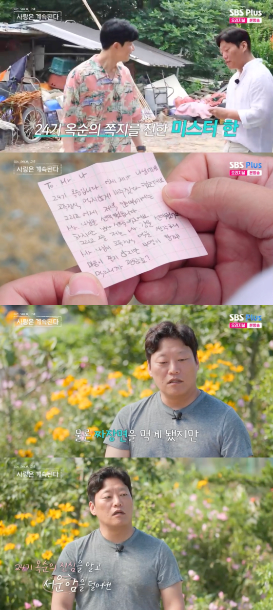 이후 미스터 한은 미스터 나에게 24기 옥순의 미안함이 담긴 쪽지를 전달해줬다. 쪽지에는 '마음이 좋지 않지만 그래도 네 명이서 같이 먹으니까 괜찮죠?'라는 너스레가 담겨 있었다.