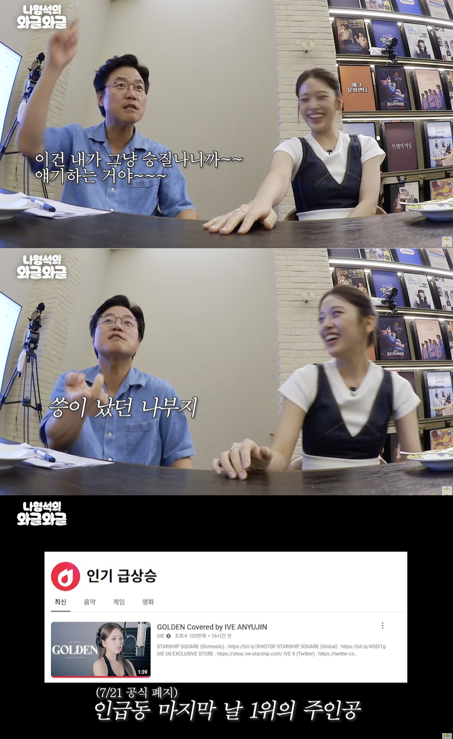 영상 속 나영석은 안유진이 아이브 공식 유튜브 채널을 통해 공개한 넷플릭스 애니메이션 '케이팝 데몬 헌터스(K-pop Demon Hunters)'의 OST 'GOLDEN' 커버 무대를 언급하며 "유진이가 'Golden' 커버한 걸 보고 너무 잘해서 기쁘게 봤다. 그런데 그 뒤로 사람들이 뭐라뭐라 말이 많아서 짜증이 났다"라고 털어놨다.