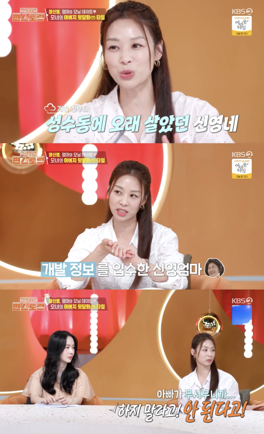 이를 들은 장신영은 "뭐든지 다 우리 집은 아빠 때문에 안 됐다"라며 웃픈 뒷담화를 보탰다.