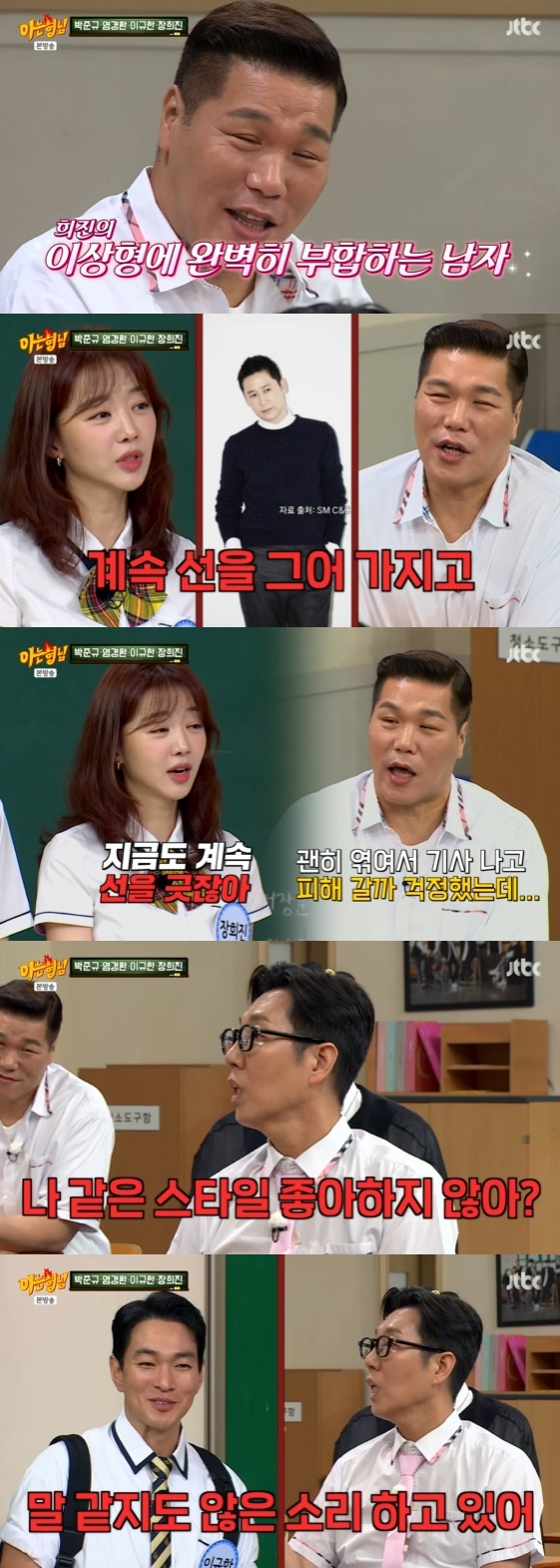 이상민은 "장훈이가 평소에는 대꾸를 안 하는데 오늘은 조심스럽다. 마음이 있는 거 아니냐"라고 몰아갔고, 이규한 역시 "장훈이 성향에 선을 긋는다는 건 마음이 있다는 거다"라고 목소리를 더했다.