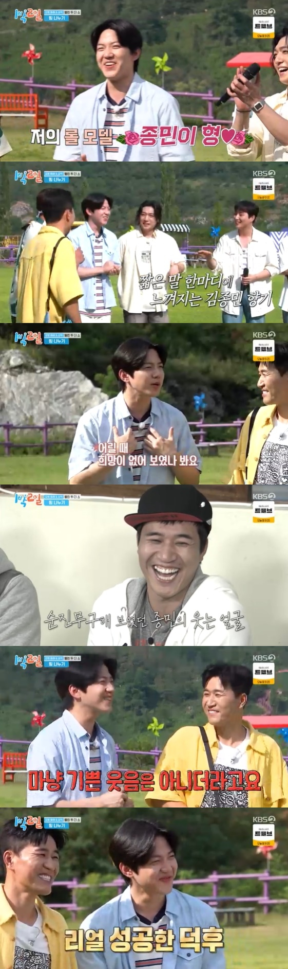 도운은 김종민을 롤모델로 삼은 이유에 대해 "엄마가 롤모델을 정하라고 하셨는데 제가 어릴 때 희망이 없어 보였던 것 같다. 그때 '1박 2일'을 보고 형님의 웃음이 순진무구하게 보여서 '저 사람처럼 돼야겠다'고 생각했다"라고 설명했다.