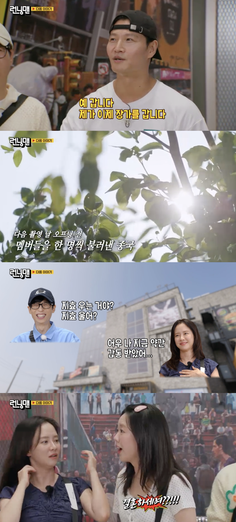 이후 멤버들은 모두 오프닝 현장에 모였지만, 충격과 혼란스러운 표정을 감추지 못했다. 지석진은 "아직도 안 믿겨지는데 진짜야?"라고 물었고, 김종국에게 직접 얘기를 듣지 못한 지예은과 최다니엘은 어리둥절한 반응을 보였다. 송지효가 "기분좋아서 저장하고 있다"라고 하자 지예은은 "결혼하세요?"라며 눈치를 챘다.