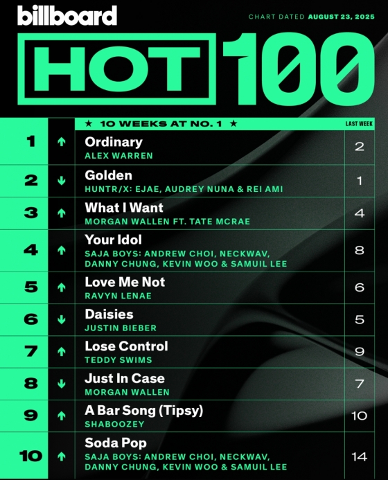 골든'은 지난 19일(한국 시각) 공개된 빌보드 핫100 차트 순위에서 2위를 차지했다. 이 곡은 지난 7월 81위로 이 차트에 진입한 이후 23위, 6위, 4위에 이어 2위로 올라서더니 7주 차에 결국 정상에 오른 바 있다.