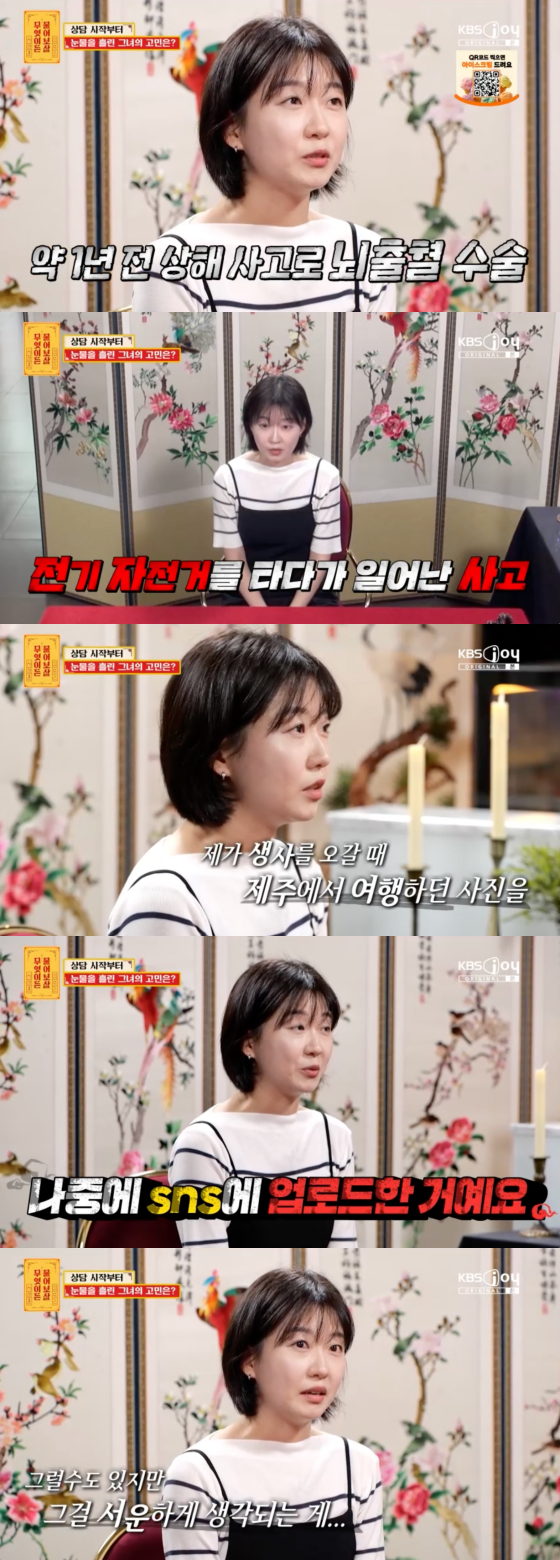 이날 사연자는 "1년 전 회사에서 만나 친하게 지내게 된 언니 4명과 함께 제주도 여행을 갔다. 거기서 전기 자전거를 타다 사고가 났고, 그 사고로 인해 뇌출혈 수술을 받았다"고 말했다.