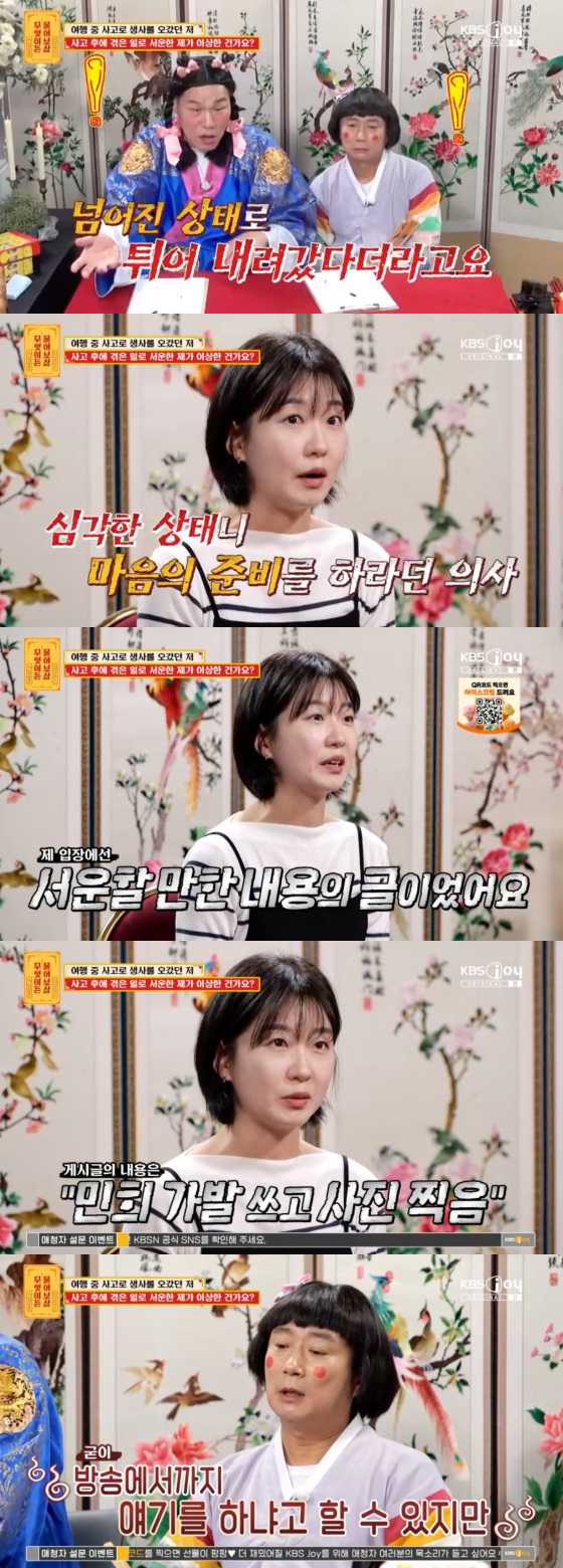사연자에 따르면 여행을 함께하던 동료들이 사고 수습에 나서 사연자를 병원으로 이송해줬고 가족에게 연락해 상황을 잘 정리했다.