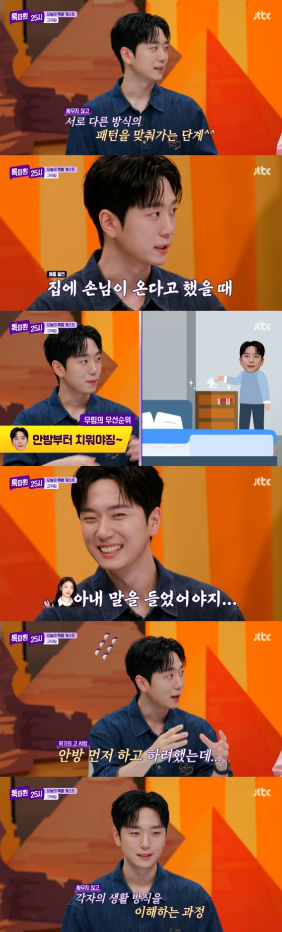 고우림은 "남편과 아내의 사소한 집안에서의 패턴에 대한 문제를 겪긴 해도 싸운 적은 없다. 예를 들어 이런 거다. 손님이 온다고 했을 때 아내는 조금 더 보이는 곳 위주로 청소를 한다면, 저는 안방부터 치우다가 한소리를 듣는 거다"라고 털어놔 웃음을 안겼다.