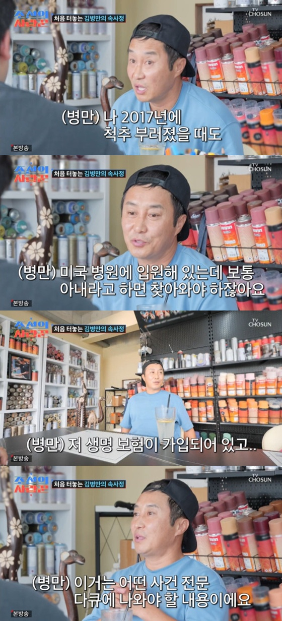 뿐만 아니라 김병만은 "2017년 제가 척추를 다쳤을 때도 미국 병원에 입원해 있는데, 보통 아내라고 하면 오지 않나. 안 왔다. 당시 제가 장애인이 되냐 하고 있을 때, 전처는 제 생명보험을 가입했다. 나 죽었으면 이 사람 돈 엄청 벌었다. 이건 '조선의 사랑꾼'이 아니라 어떤 사건 전문 다큐에 나와야 할 내용이다. 지금 그런 상황이다"라고 밝혀 안타까움을 더했다.