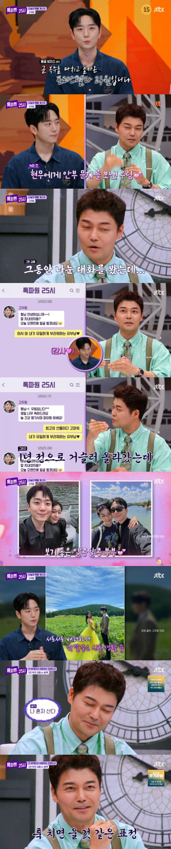 MC 전현무는 고우림의 출연을 남다르게 반겼다. 그는 "고우림이 여기 나온다고 내게 톡을 보냈다. 이전 톡도 내 생일 축하한다고 먼저 보냈더라. 근데 내가 다 답을 뭐라고 했냐면, '유일하게 부러워하는 유부남'이라고 한 거다. 1년 전에도 이렇게 얘기했더라. 복붙(복사+붙여 넣기) 한 게 아니라 내가 진짜 부러웠나 봐"라고 동경의 눈빛으로 바라봤다.