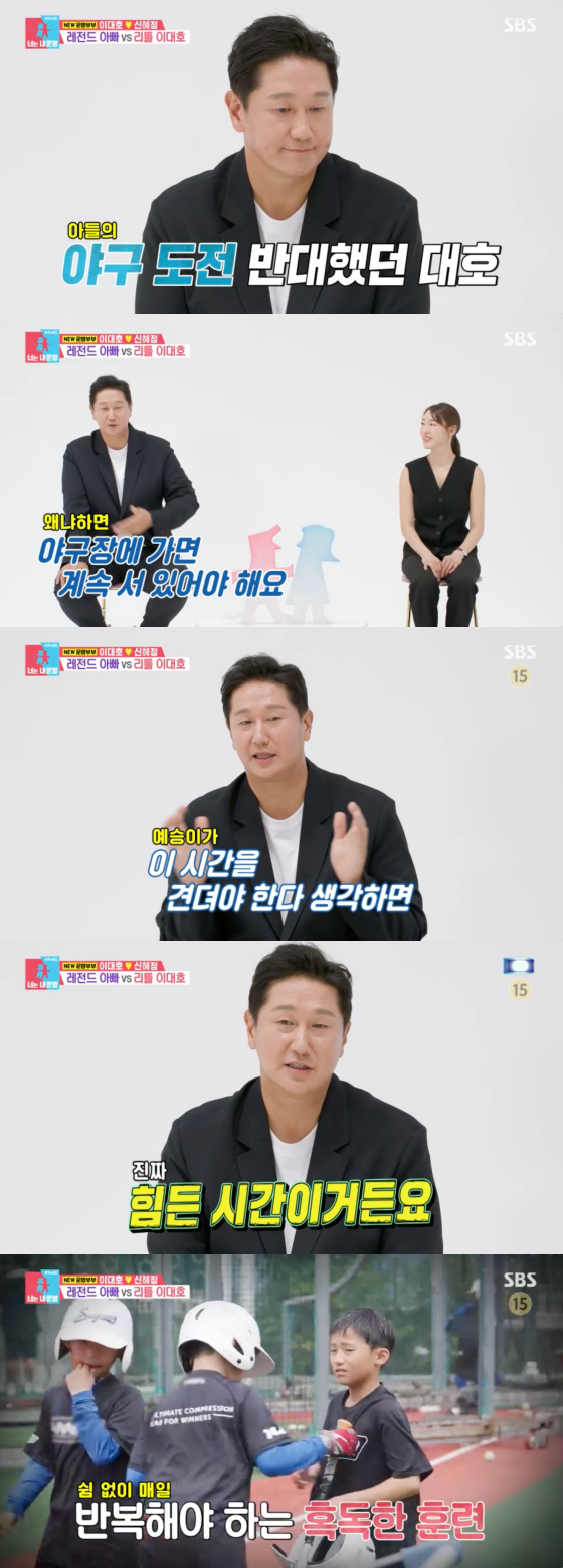이대호는 아들의 야구 시작을 반대했던 이유에 대해 "야구장에 가면 계속 서 있어야 한다. 숙였다가 일어났다가, 누구 한 명 잘못하면 단체로 기합받고 그래야 한다. 땡볕에 쉬지도 못한다"고 말했다.